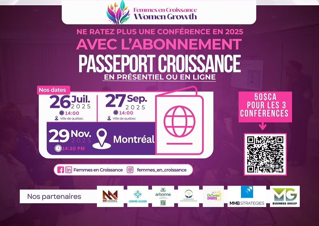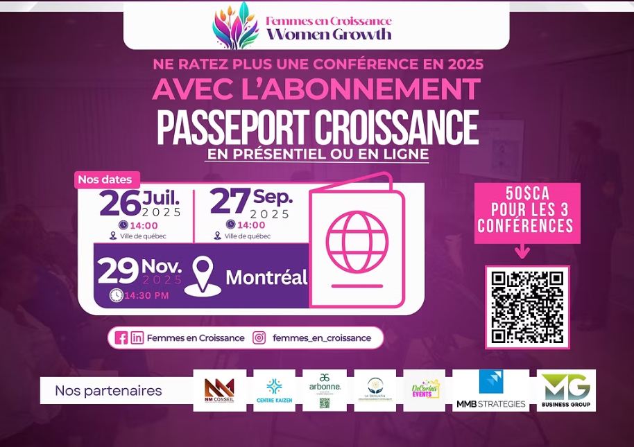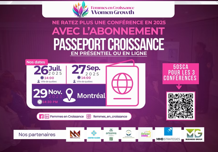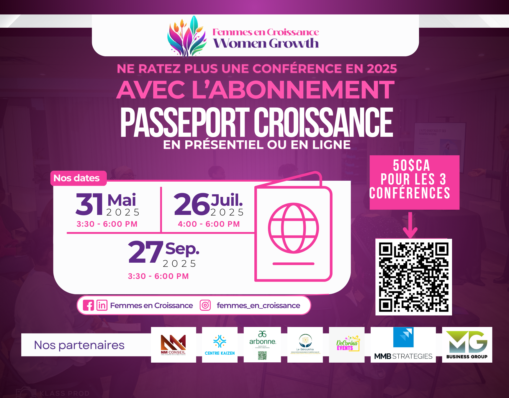 NE RATEZ PLUS UNE CONFÉRENCE EN 2025 AVEC L'ABONNEMENT PASSEPORT CROISSANCE EN PRÉSENTIEL OU EN LIGNE Nos dates : 50$CA POUR LES 3 CONFÉRENCES Nos partenaires : Suivez-nous sur : Instagram: @femmes_en_croissance Facebook: Femmes en Croissance