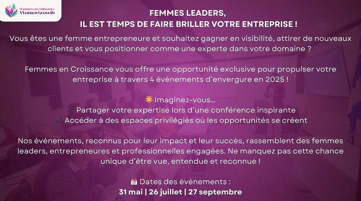 FEMMES LEADERS, IL EST TEMPS DE FAIRE BRILLER VOTRE ENTREPRISE ! Vous êtes une femme entrepreneure et souhaitez gagner en visibilité, attirer de nouveaux clients et vous positionner comme une experte dans votre domaine ? Femmes en Croissance vous offre une opportunité exclusive pour propulser votre entreprise à travers 4 événements d’envergure en 2025 ! […]