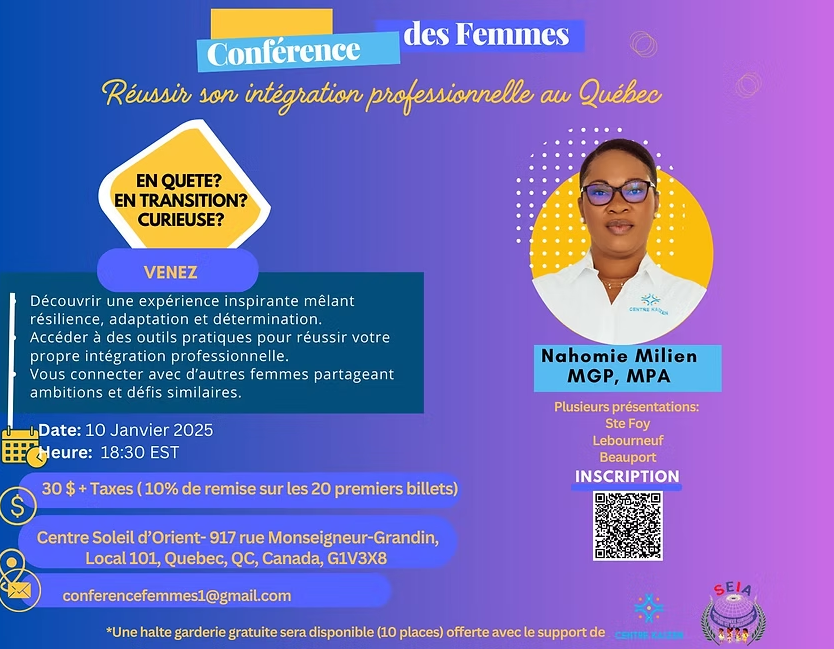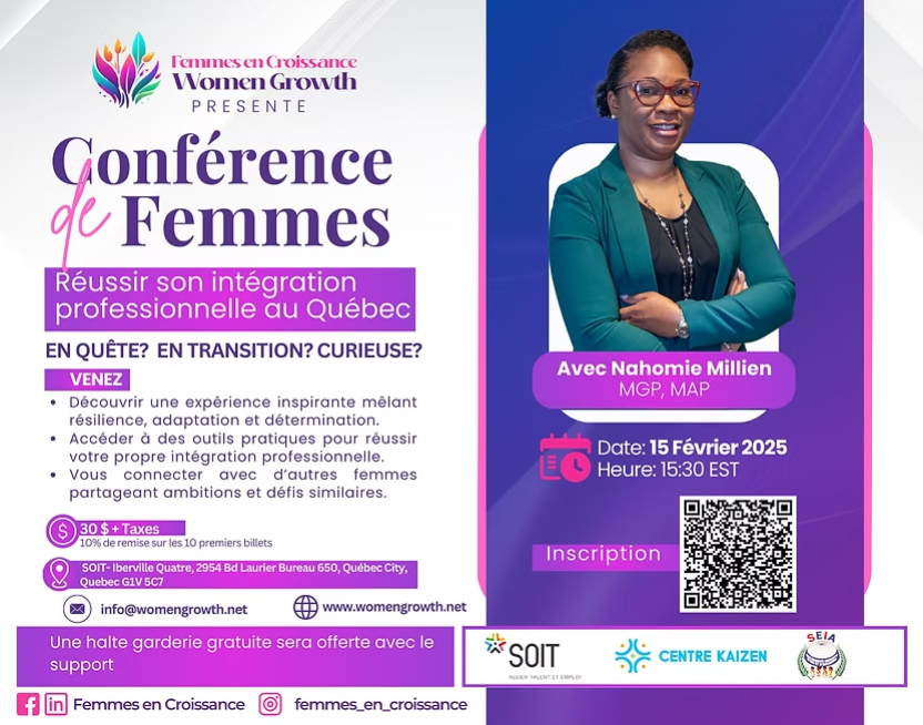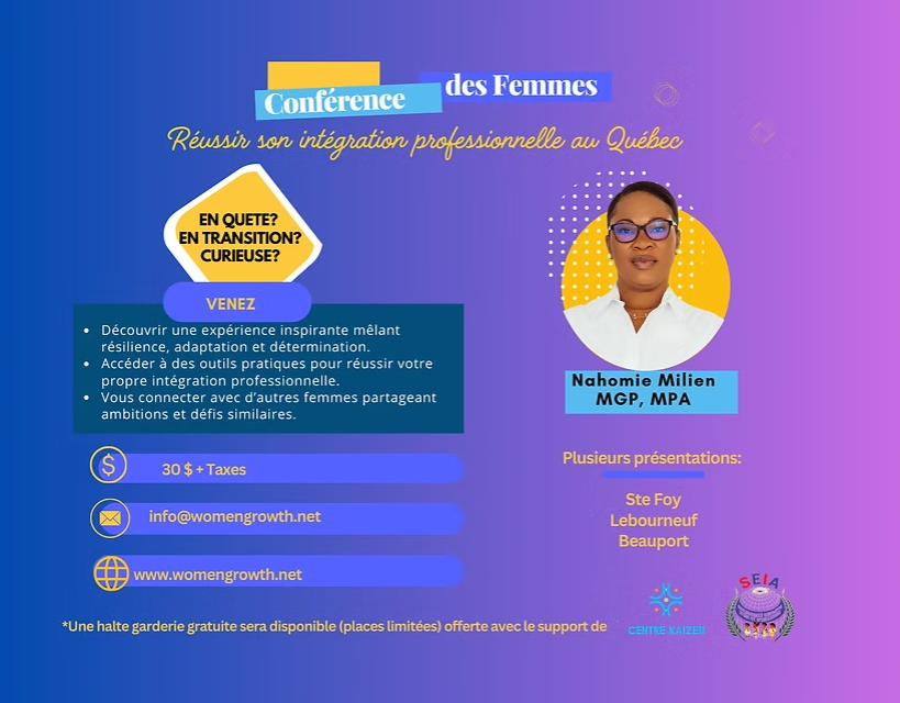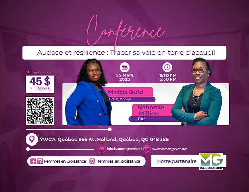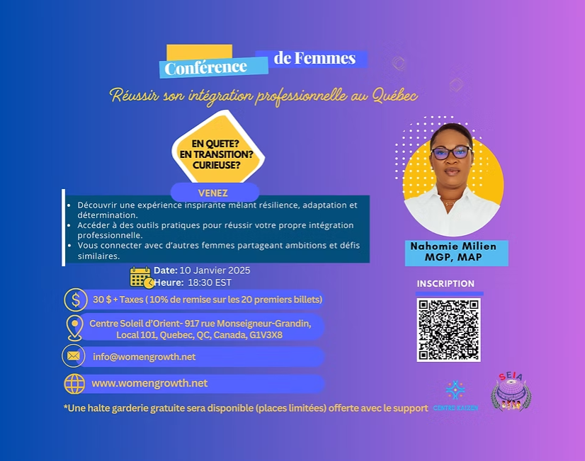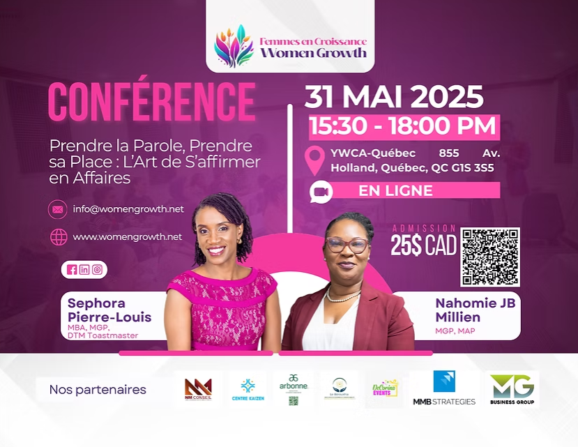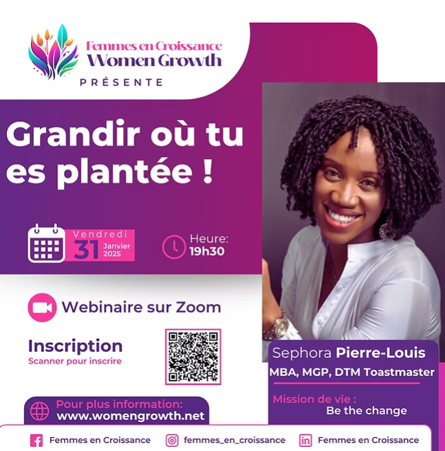 De Haïti au Canada : une histoire de résilience et d’intégration réussie. Rejoignez-moi pour une conférence inspirante où je partagerai les clés d’une stratégie qui m’a permis de transformer des défis en opportunités, tout en soutenant l’avancement économique et social des femmes.